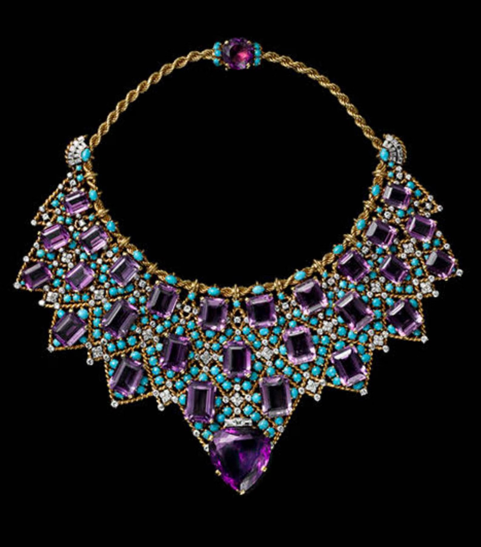 Made in India, it’s available with your choice of moissanite or diamonds, and the setting is gilded sterling silver set with amethysts and turquoise. The good news – the price is nowhere near the original Cartier piece, which sold for USD$605,000 in 1987. Using diamonds, it’s CAD$2,249.69. With moissanite, it’s $1,377.94.