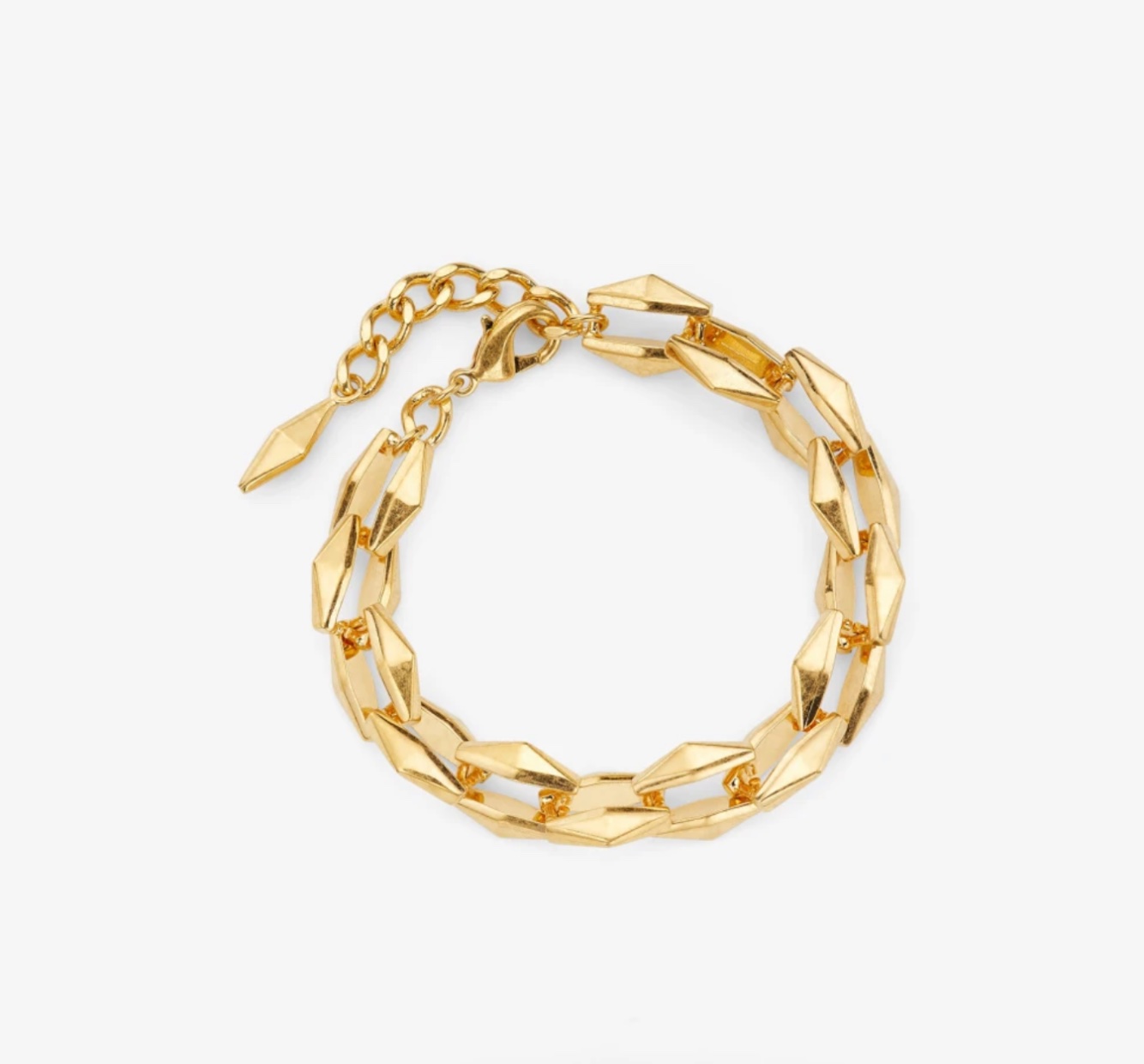 This bracelet is gold plated brass, with a unique chain design. It’s priced at USD$595.