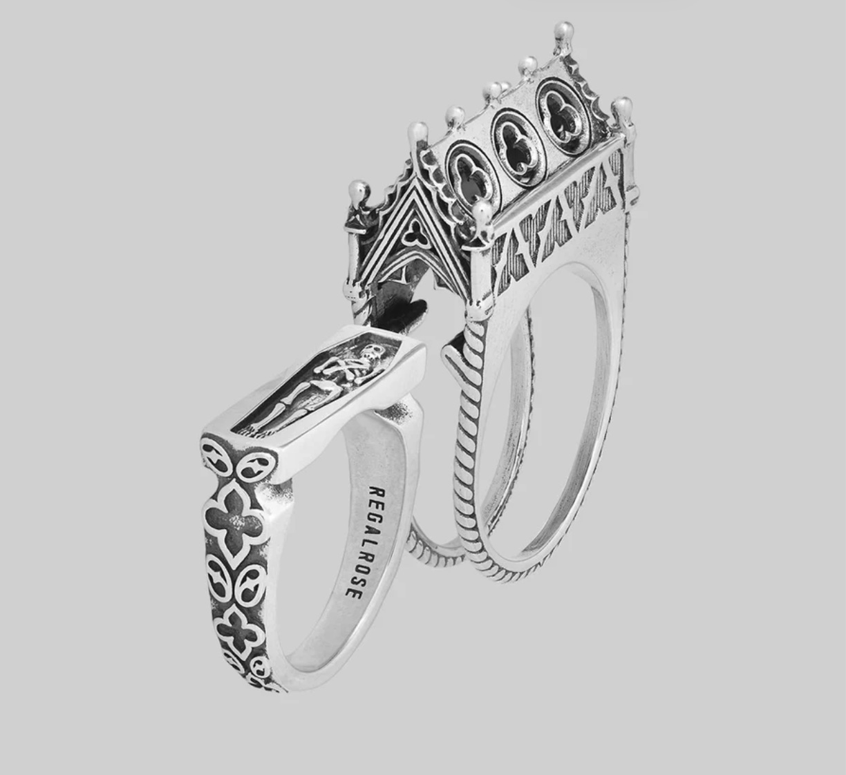 This ring is perfect for the Gothic (or goth) lover in your life. The pair of rings from Regal Rose is described by the designers: “Inspired by Gothic cathedrals, this striking ring features intricate cut out tracery windows framed by pointed arches and decorative pillars. The ring band is detailed with ornamental gothic engravings. A secret second ring pulls out from within the grandeur revealing a catacomb with resting skeleton.”