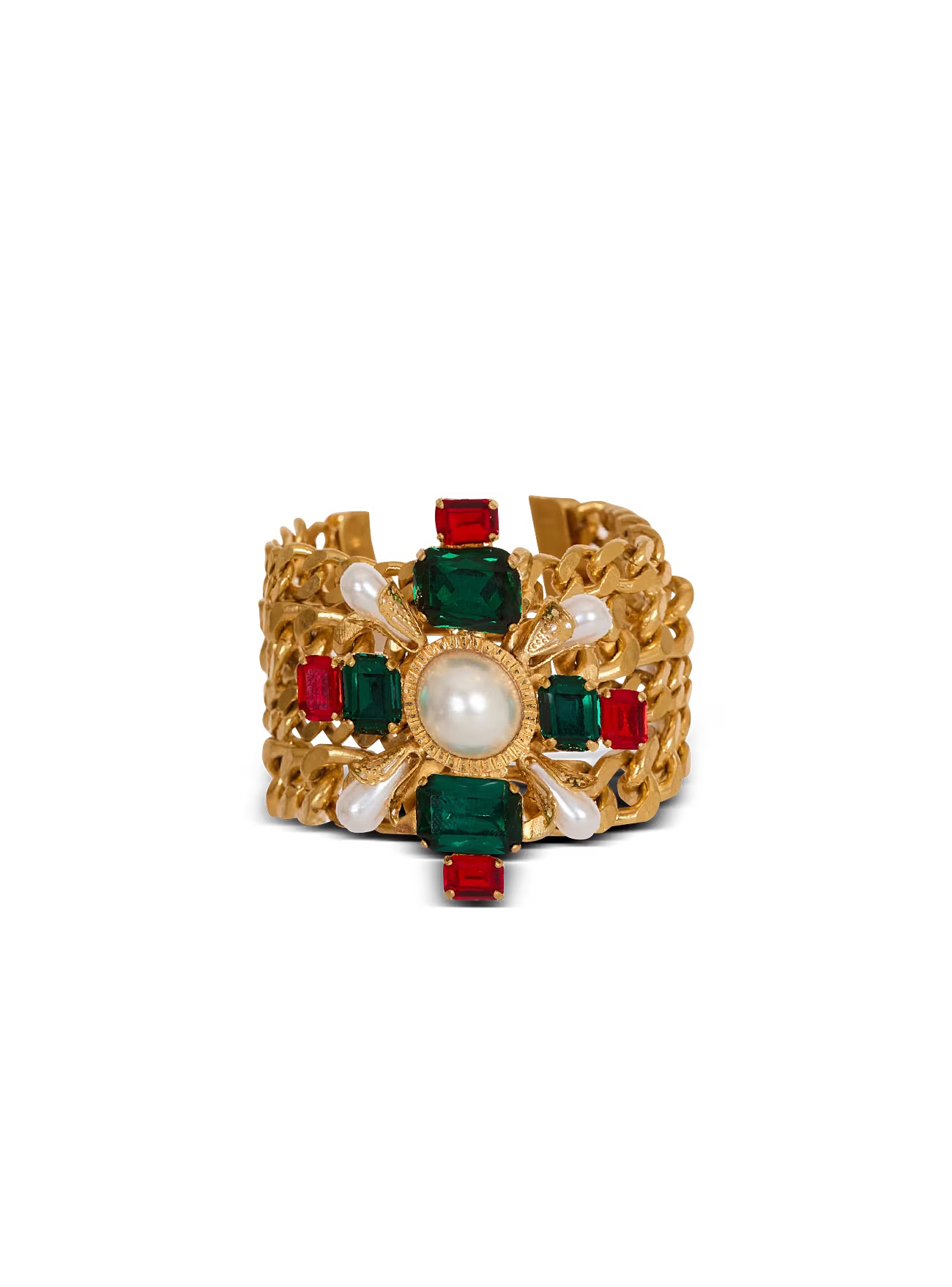 This bracelet by Balmain is quite similar to a Maltese cross cuff from Kenneth Jay Lane, which itself was modeled on the cuffs fine jeweller Verdura made for Coco Chanel.