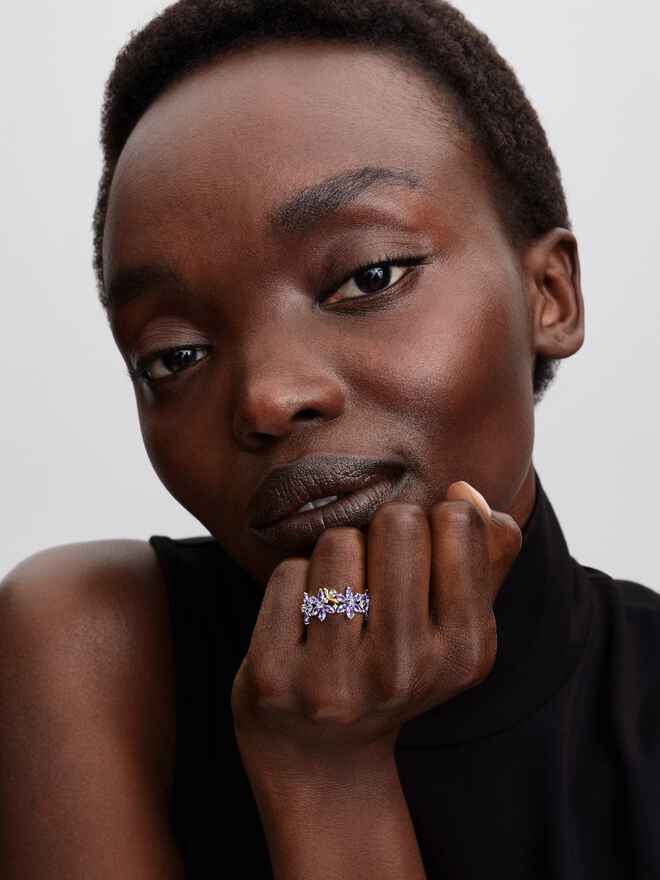 This ring is part of a collaboration with Pandora. It features cubic zirconia and crystal stones set in sterling silver, in a striking lavender shade.