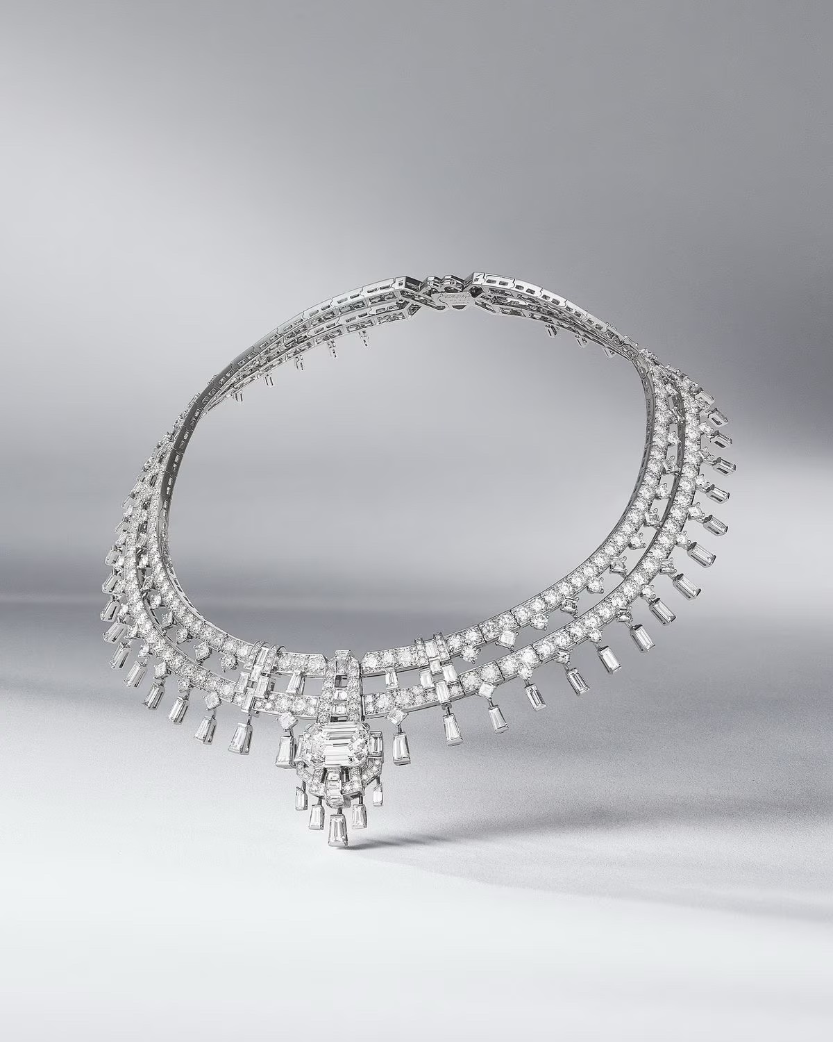 They explain, “The Fabulous Fifties necklace pays homage to the glamor of that decade. Its radiant lines evoke the rivers of diamonds that glimmered on the big screen in the black – and – white films of the time, making High Jewelry houses famous. The necklace’s fully articulated openwork structure brings together lightness and comfort when worn. The design features round, square, calibrated and baguette-cut diamonds set using the rail, closed, half-closed, and grain setting techniques. At the heart of the central motif, an emerald-cut DIF Type 2A diamond of 10.06 carats plays with the light, allowing it to pass through its pure and finely crystallized material. The stone’s cut exhibits “tennis court” proportions, giving the stone a lovely harmony between length and width.“