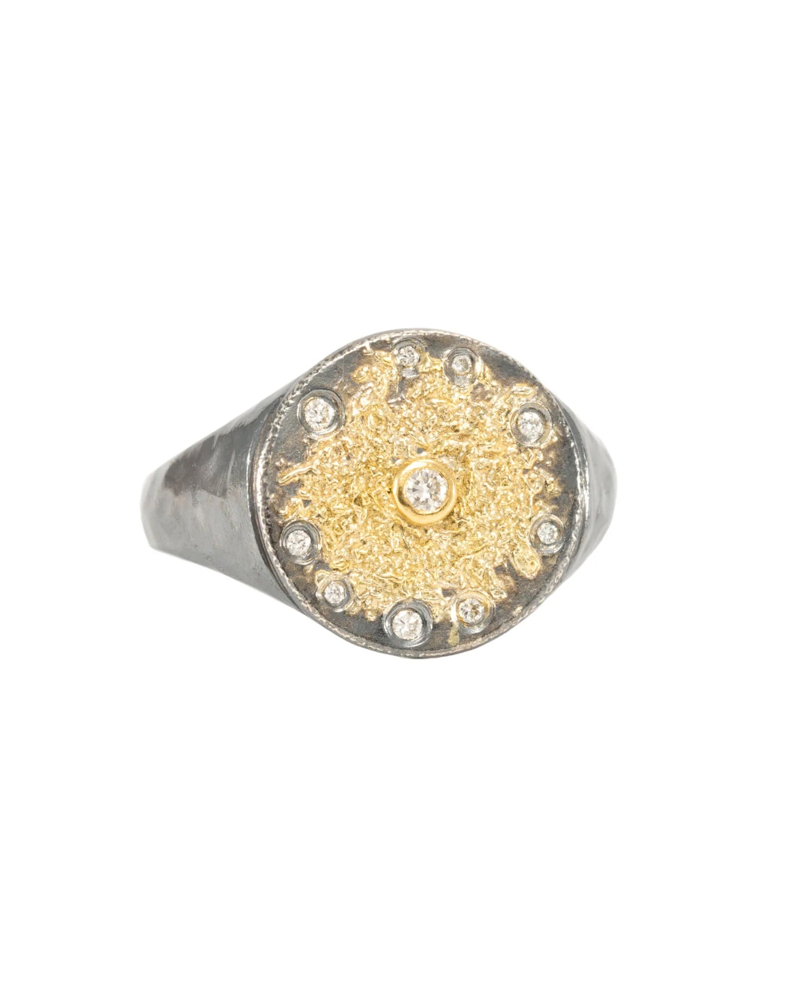 The design of this ring by Kate Maller reminds me of one I bought from San Antonio silversmith Alejandro Sifuentes. They both have a sterling silver base with gold dust and small diamonds on the top and are very striking.